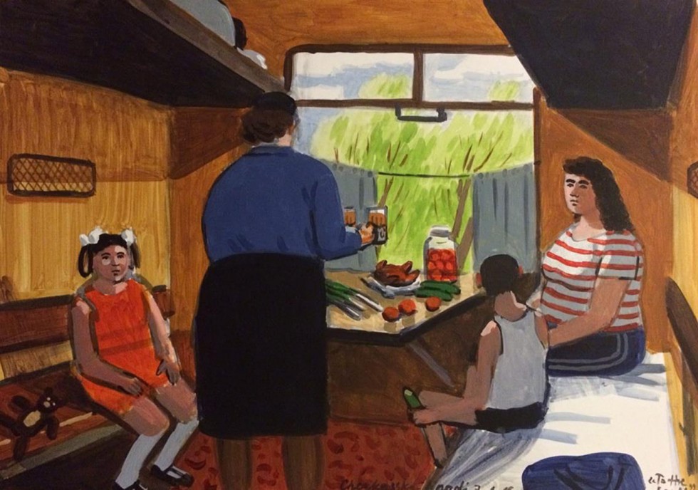 Правадніца прыносіць гарбату ў купэ. Мастачцы падабаецца, што яе працы выклікаюць спрэчкі: «Ня ўсе павінны цікавіцца мастацтвам, і я рада, што мае працы так хвалююць людзей, што яны цэлымі днямі пішуць гнеўныя камэнтары ў фэйсбуку. Для мяне гэта дасягненьне».