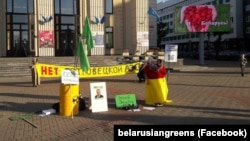 Актывісты Беларускай партыі «Зялёныя» 9 верасьня на плошчы Якуба Коласа ў Менску разгарнулі транспарант «Не Астравецкай АЭС».