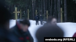 На завяршэньне ўдзельнікі акцыі памяці паставілі каля крыжоў запаленыя зьнічы і прасьпявалі малітоўны гімн «Магутны Божа».