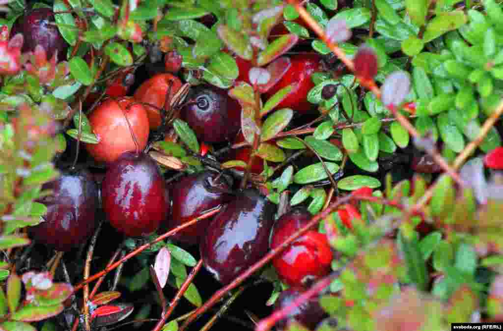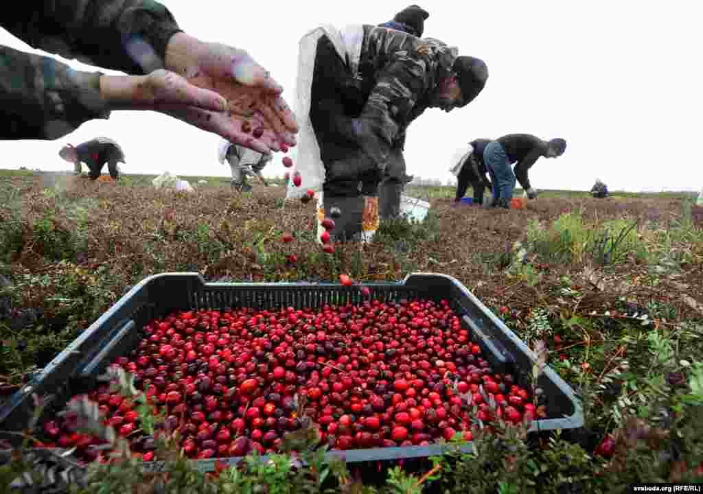 Уручную зьбіраюць на элітных чэках, дзе журавіны лепшай якасьці, каб іх не пашкодзіць. Дзеля гэтага з чэкаў зьліваюць ваду