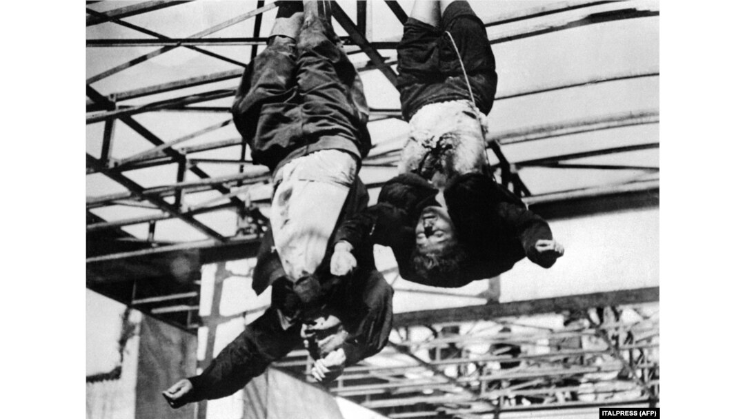 Целы італьянскага дыктатара Бэніта Мусаліні (зьлева) і яго каханкі Кларэты Петачы павешаныя перад гаражом на плошчы Лярэта ў Мілане 29 красавіка 1945 года, на наступны дзень пасьля таго, як яны былі пакараныя італьянскімі партызанамі