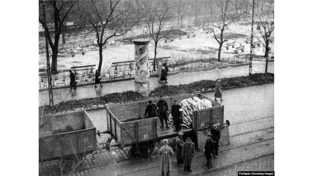 Вышэйпрыведзенае фота, зробленае з Будайскай крэпасьці, зьяўляецца адным з сотняў здымкаў, што захоўваюцца ў вугорскім архіве Fortepan, на якіх адлюстраваныя маштабы разбурэньня Будапэшту пасьля 13 лютага 1945 г. У той дзень страляніна змоўкла пасьля сямі тыдняў разбурэньня, якое стане вядомым як аблога Будапэшту.