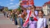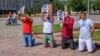 Каля ста дзяўчат сталі ў ланцуг у белым адзеньні і зь белымі і чырвонымі кветкамі каля аўтавакзалу ў Горадні.